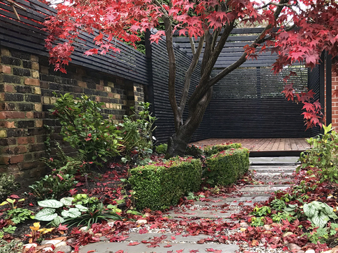 Modern influences such as the high line in New York, prairie planting such as Piet Udolph's work were combined in a deconstructed approach with classic japanese influences and historic local components. The existing weathered red brick walls were left exposed with slat trellis and pleaching providing privacy whilst concealing modern brick additions to the upper courses. Gravel, oak railway sleepers and 'cobbled' setts mix in different ways with each other and 'walk on' planting to provide varied surfaces. All merge into bespoke cut modern 'plank' paving .